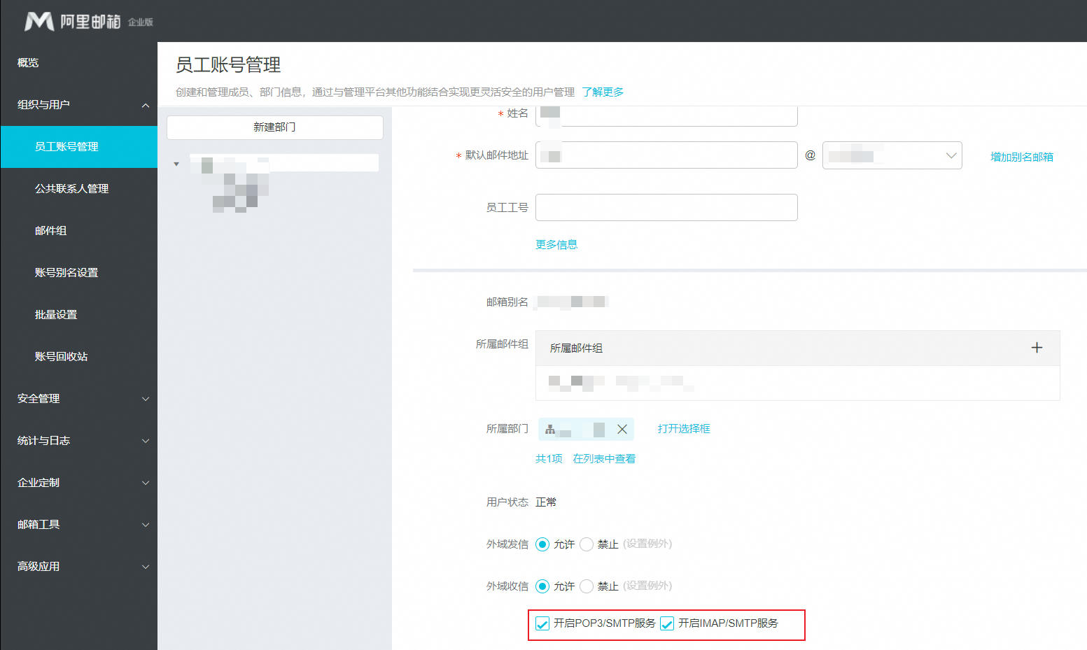 同时要使用POP/IMAP/SMTP协议,需要保持账号维度的开启。
