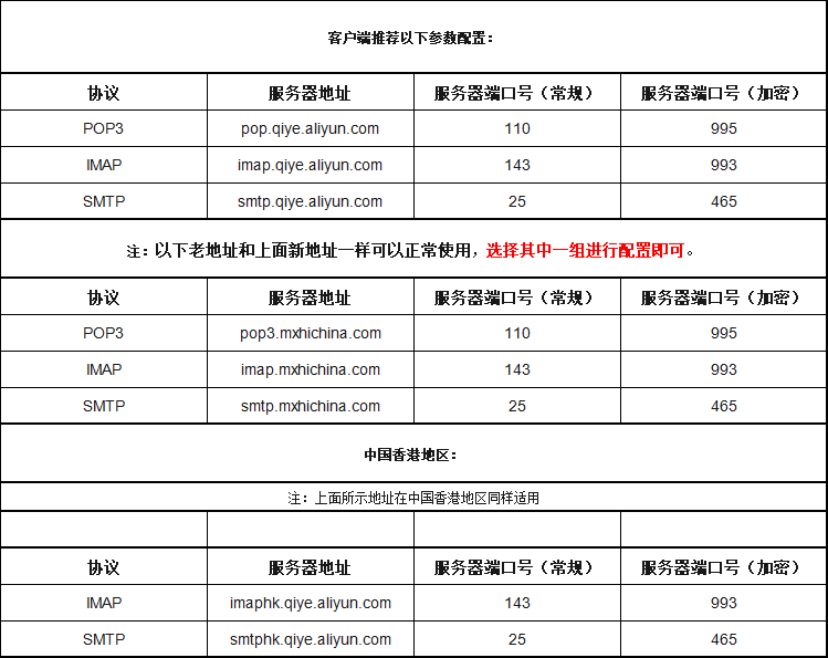 1、协议 POP3,服务器地址 pop.qiye.aliyun.com
